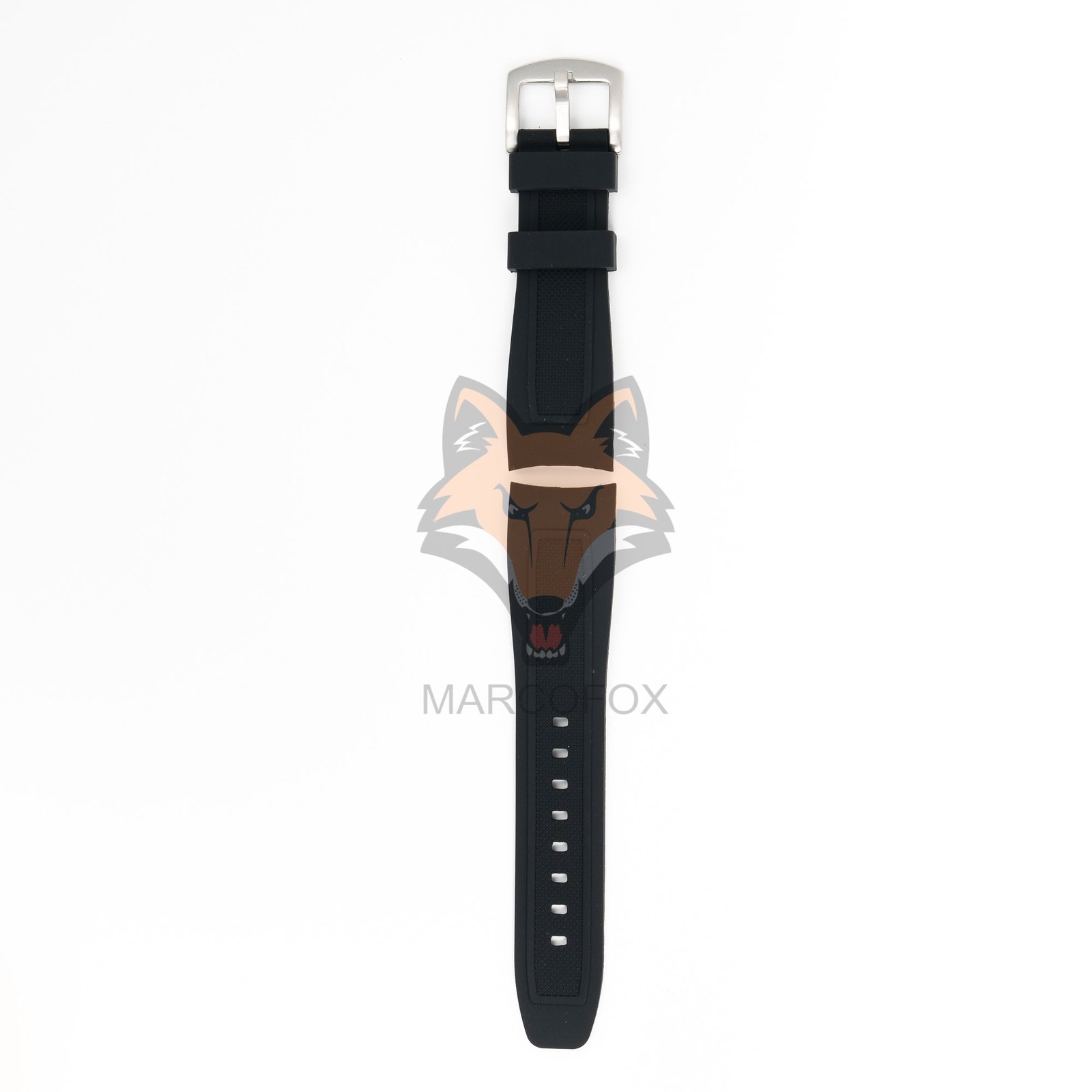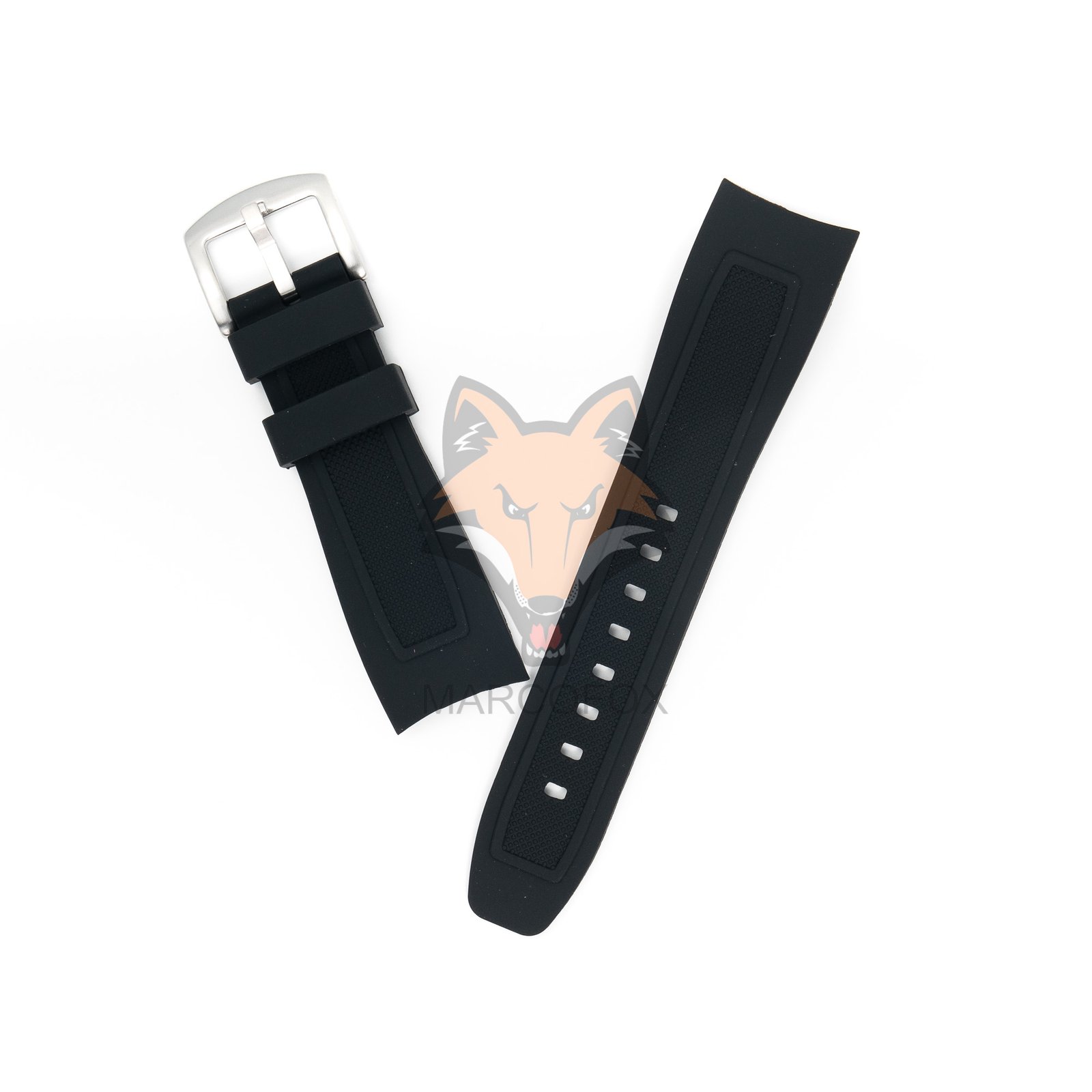 Pulseira de silicone com fivela de aço. Com dois furos para facilitar o encaixe na caixa do relógio